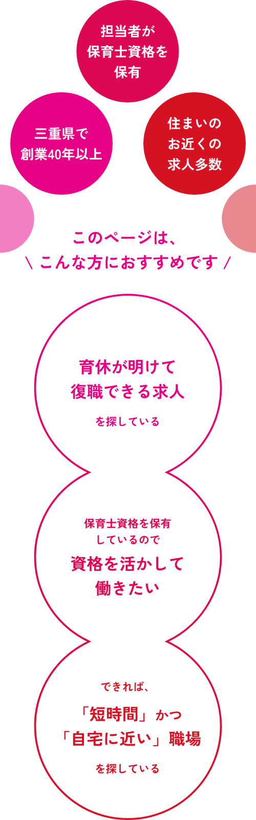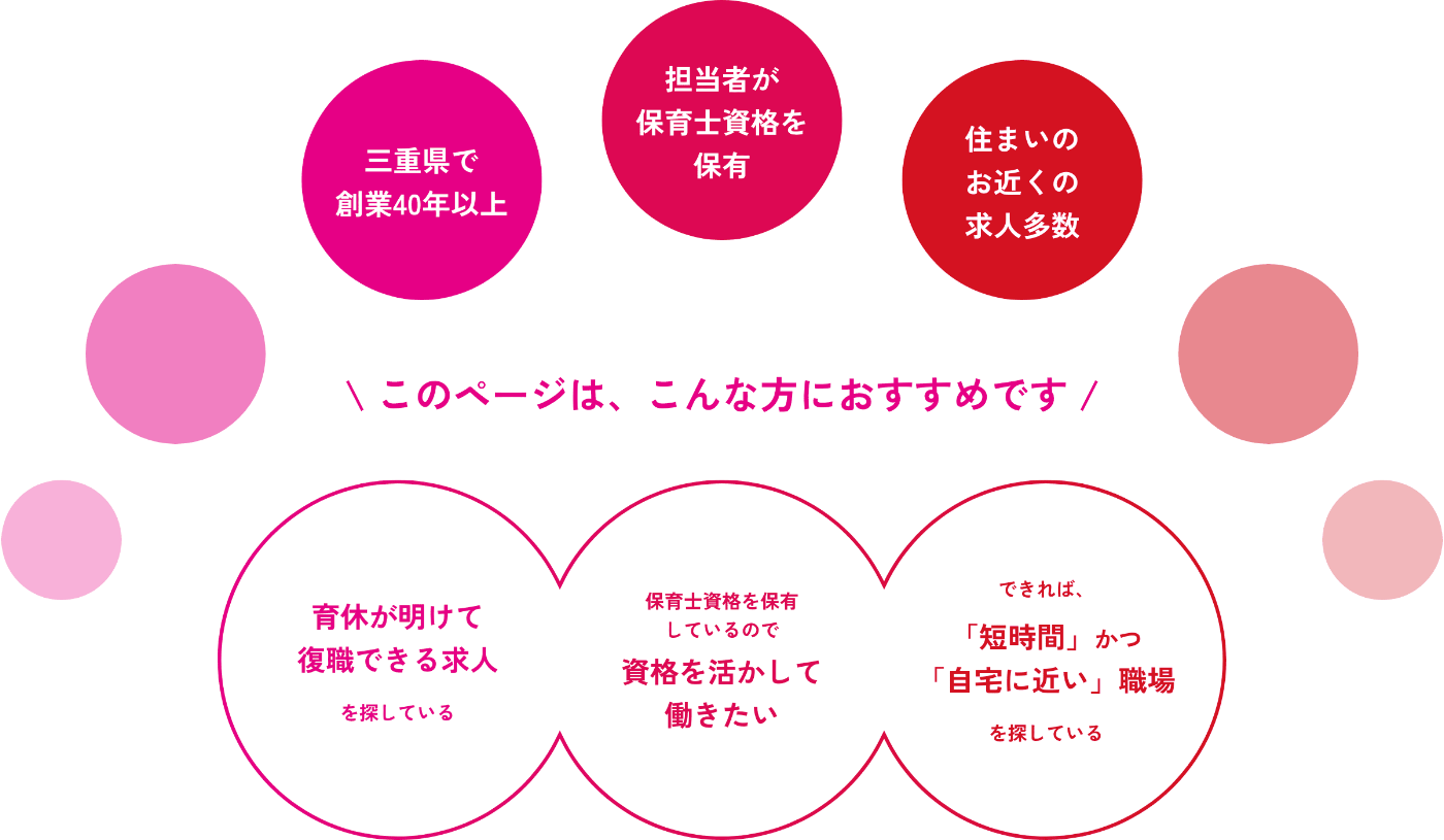 三重県各市で豊富に求人を取り扱っているので、働きやすく、ご自宅から近い職場を数多くご紹介できます。