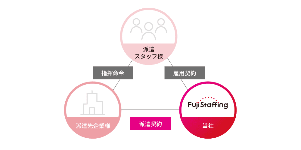 人材派遣は、派遣スタッフ・派遣元(フジスタッフィング)・派遣先の園の3者により成り立っています。