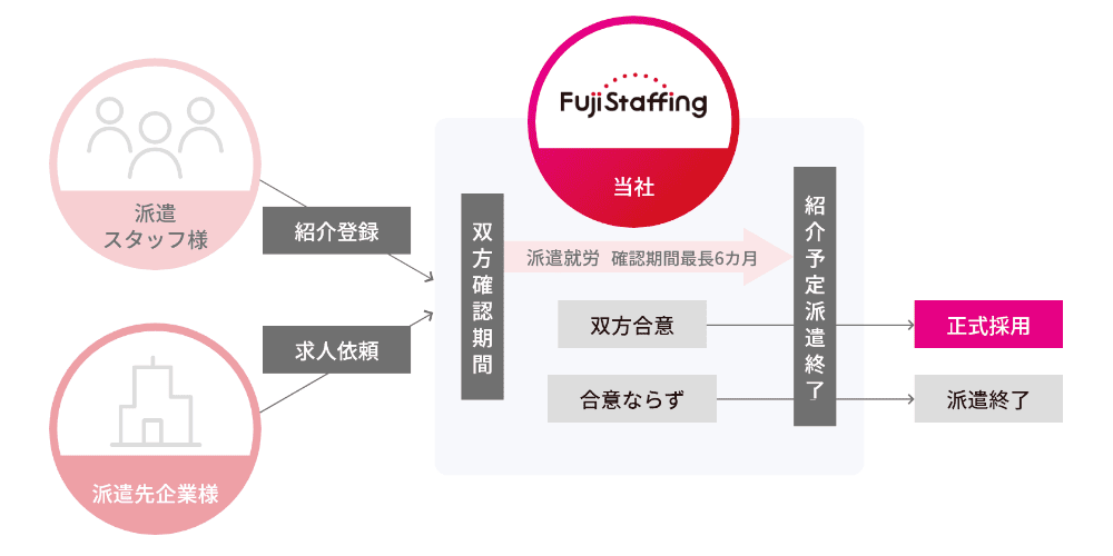一定期間(最長6カ月)派遣スタッフとして就労した後、園と就労者、双方の希望が一致すればその企業の直接雇用に切り替えるシステムです。